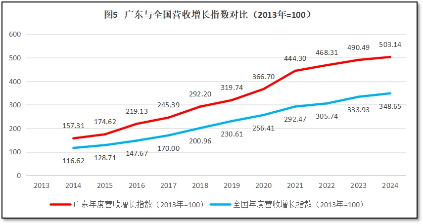 由上图可见,广东省检验检测行业营收增长指数保持了持续较快增长,且远高于全国平均数,最近几年与全国平均数的差距越拉越大,2024年度的增长指数比全国平均数高出超过150,显示出极强的增长实力和发展后劲。
